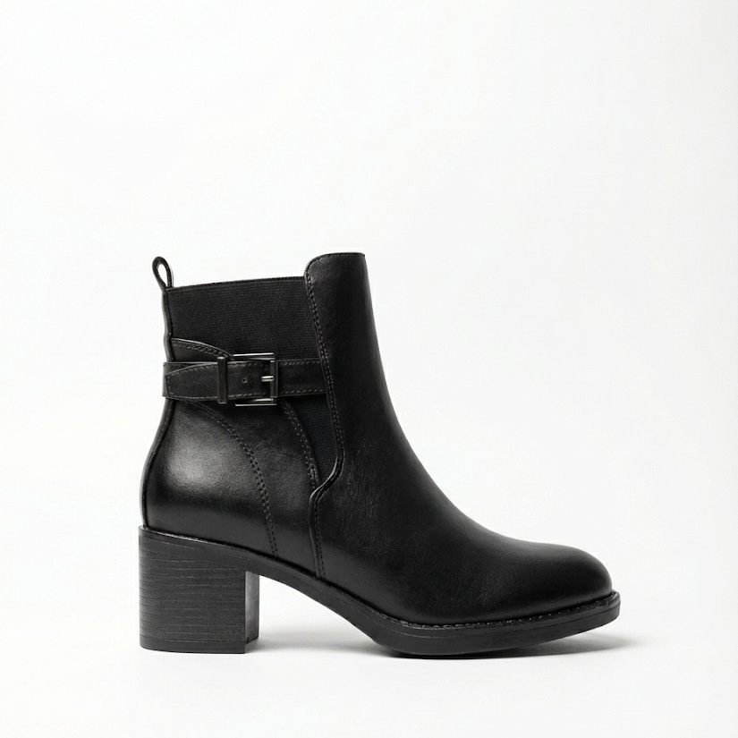 Meet your new everyday essential: the versatile and timeless black ankle boot. Featuring a sleek silhouette and a comfortable mid-height block heel, this pair is designed for both style and stability. The boots are accentuated with an adjustable decorative buckle strap and elasticated side panels for an easy slip-on fit. Perfect for navigating the city or dressing up a casual look, these boots offer dependable style season after season.