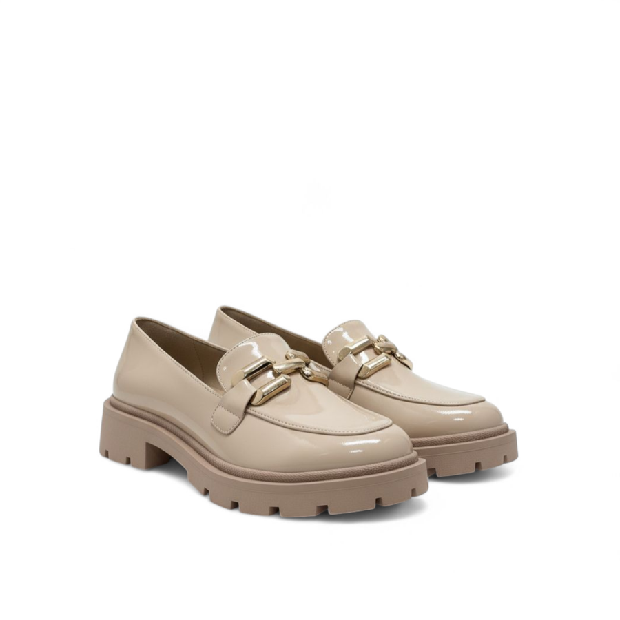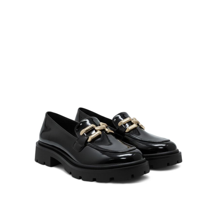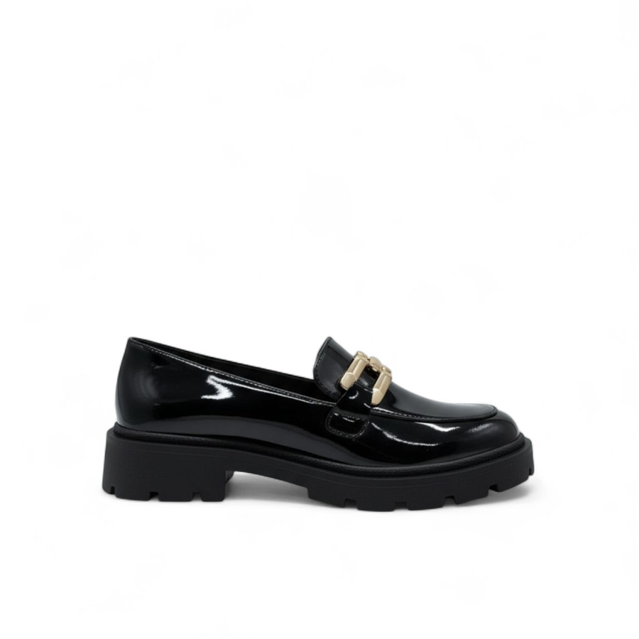 Crafted from premium patent leather with a high-gloss finish. Durable, chunky rubber lug sole for traction and stability. Polished gold-tone metal hardware on the vamp. Soft, breathable lining for all-day comfort.