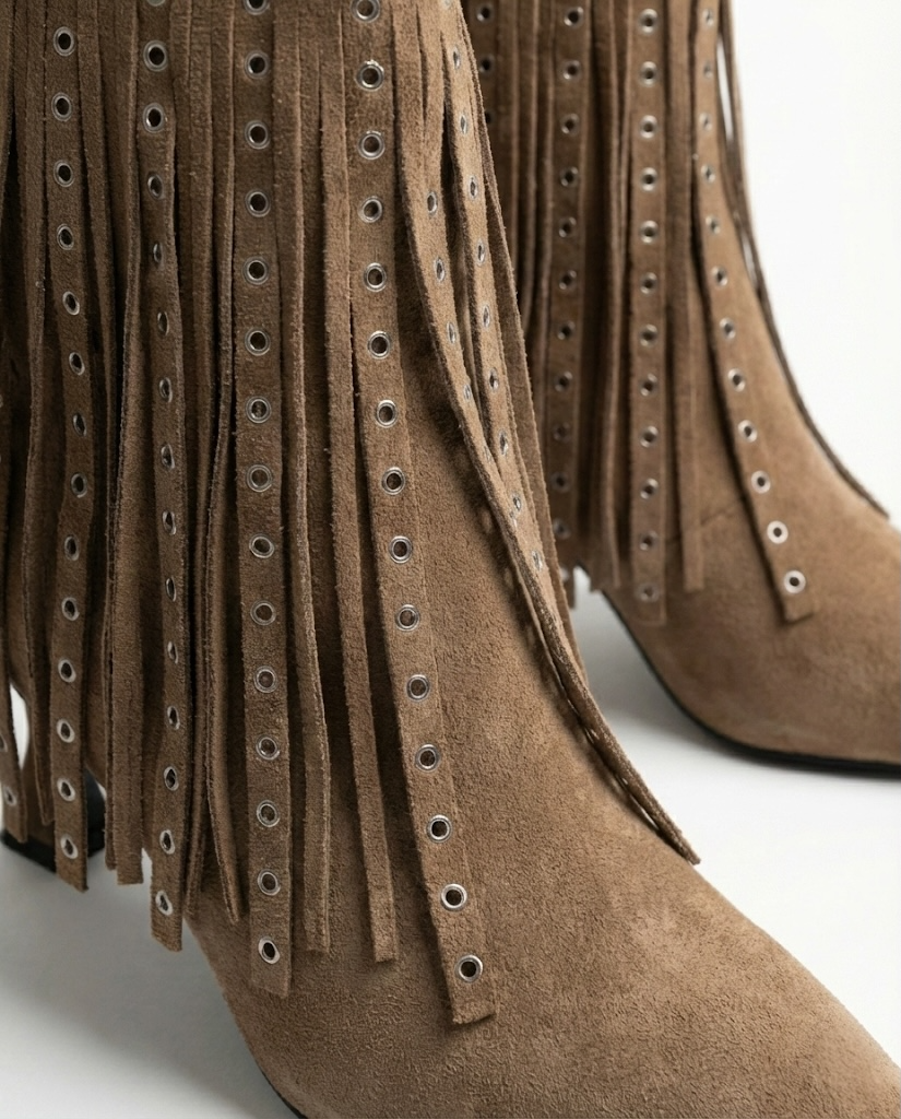 Make a striking statement with these Western-inspired ankle boots. Crafted from luxurious khaki suede, this eye-catching design features dramatic, full-length fringe that moves with you. The fringe is elegantly adorned with silver-tone metal studs, adding a touch of edgy sophistication. Finished with a sharp pointed toe and a unique flared heel, these boots are the perfect piece to instantly elevate any look from casual denim to evening wear.