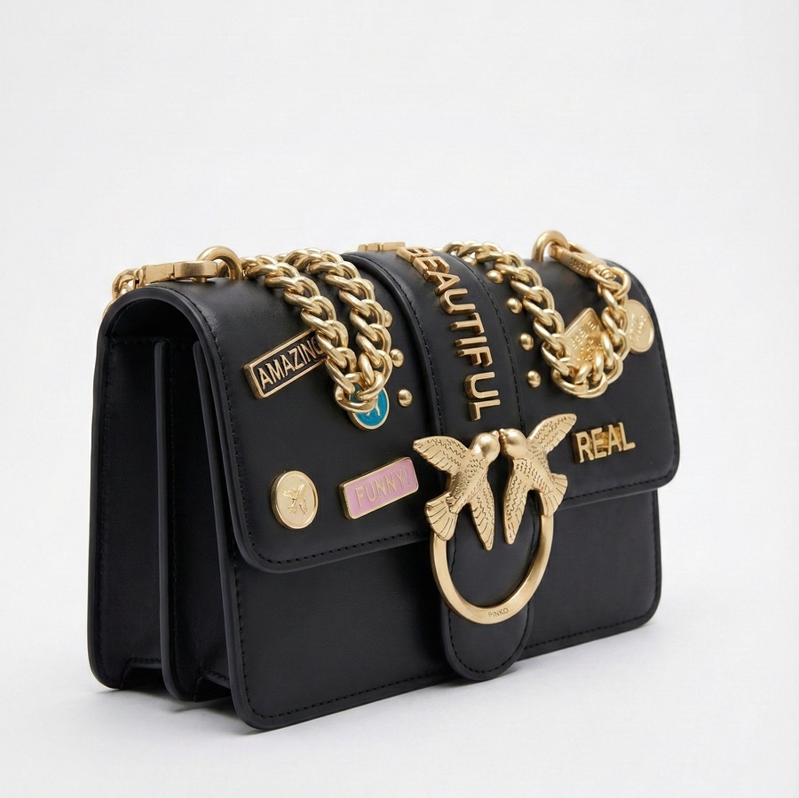 Stand out with this edgy and modern shoulder bag. Crafted from smooth, high-quality leather, it features bold gold lettering, playful pins, and the iconic bird buckle. A perfect compact size to carry your essentials with style.