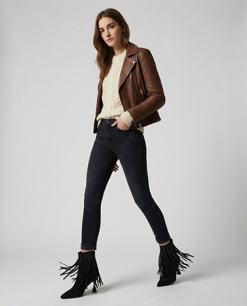 Make a striking statement with these Western-inspired ankle boots. Crafted from luxurious black suede, this eye-catching design features dramatic, full-length fringe that moves with you. The fringe is elegantly adorned with silver-tone metal studs, adding a touch of edgy sophistication. Finished with a sharp pointed toe and a unique flared heel, these boots are the perfect piece to instantly elevate any look from casual denim to evening wear.
