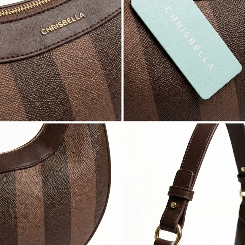 Elevate your everyday essentials with the CHRISBELLA Crescent Shoulder Bag. Designed with a sophisticated, timeless vertical stripe pattern in contrasting mocha and rich brown tones, this bag blends classic style with modern functionality.