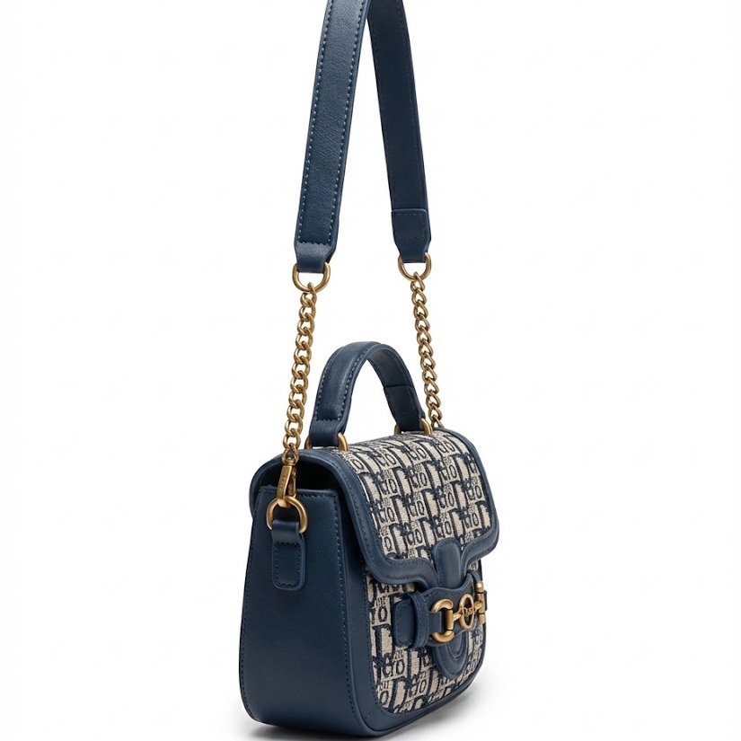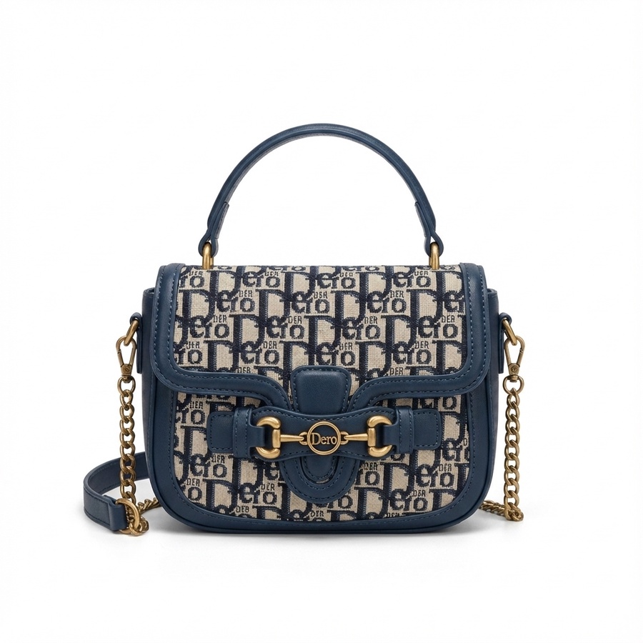 Embrace effortless elegance with this structured saddle bag, showcasing a bold navy monogram pattern on a neutral canvas background. The design is framed by smooth navy blue leather trim and a sturdy top handle for a sophisticated finish. Highlighted by a signature gold-tone horsebit buckle and chain strap details, this accessory offers a luxurious touch that perfectly complements both casual and dressy looks.