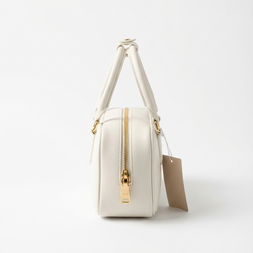 Elevate your style with this Miu MIu pristine white top-handle bag. Minimalist yet striking, it showcases a smooth matte finish ("Masseh" Leather look) with detailed logo embossing and elegant gold zippers. Its boxy shape ensures your essentials stay organized, while the comfortable handles make it effortless to carry. A perfect mix of luxury and practicality for the modern fashionista.