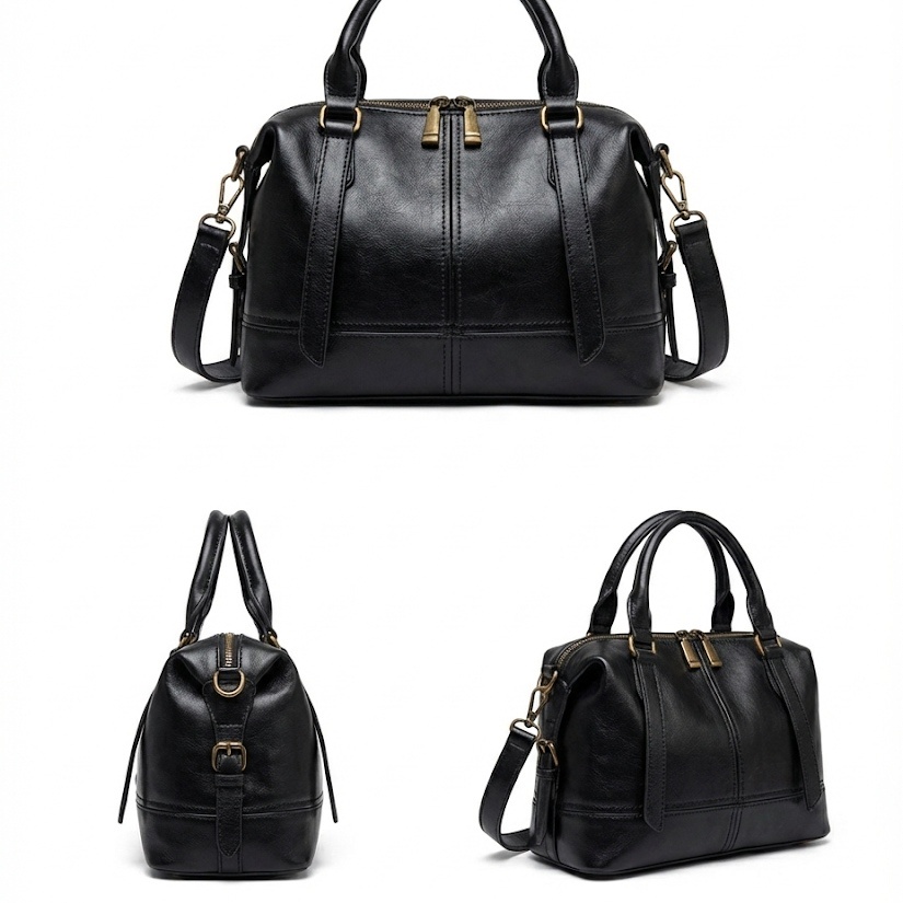 Elevate your everyday style with this timeless black leather satchel, designed for both elegance and functionality. Crafted with a rich, textured finish and accented by antique gold-tone hardware, this bag exudes a sophisticated vintage charm. It features sturdy dual top handles and a detachable, adjustable shoulder strap, allowing you to carry it as a handbag or wear it comfortably as a crossbody. The spacious interior is secured by smooth double zippers, keeping your essentials safe and organized. With its structured silhouette and durable stitching, this versatile accessory is the perfect companion for the office, travel, or weekend outings.