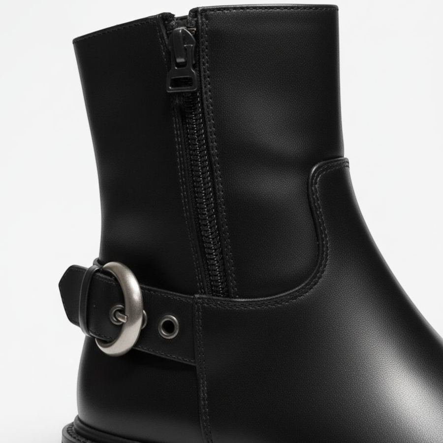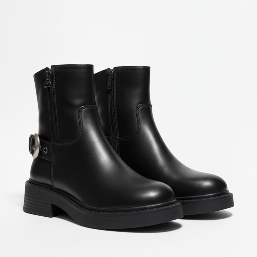 Meet your new everyday essential: the Classic Black Zip-Up Ankle Boots. These boots offer a sleek, minimalist silhouette enhanced by a decorative side buckle for a touch of modern edge. Crafted with a smooth finish and a durable sole, they are designed for all-day comfort. The convenient side zipper ensures you can slip them on and off with ease. Whether paired with jeans or a dress, these boots add a polished finish to any outfit.