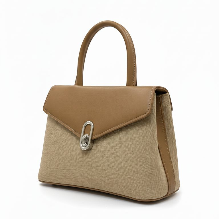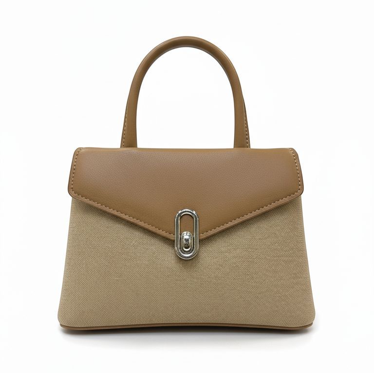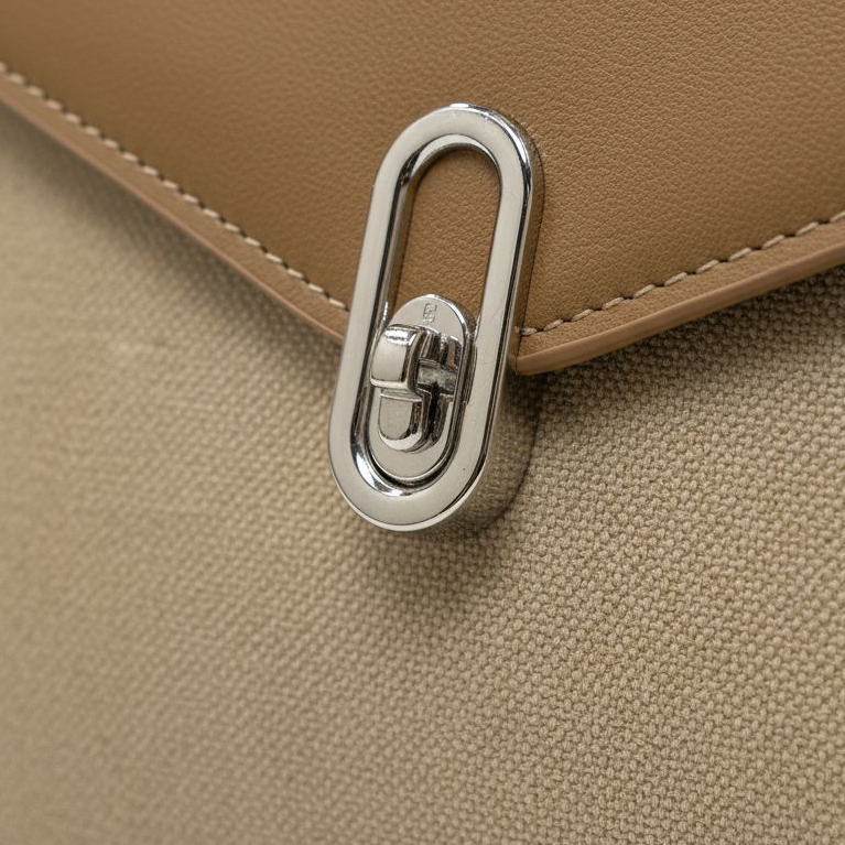 Discover the perfect balance of classic charm and modern elegance with this exquisite top-handle bag. Crafted from high-quality structured canvas paired with smooth leather trim, this bag offers a sophisticated material contrast that is durable and refined. Its clean, trapezoidal silhouette is accentuated by a classic envelope flap with a sleek silver-tone oval twist lock, adding a polished, architectural touch.
