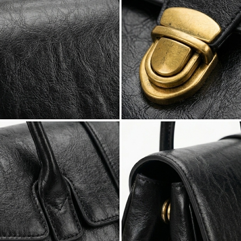 Step out in style with this exquisite cognac satchel, designed to bring a touch of vintage luxury to your daily wardrobe. The bag features a glossy, textured leather finish that catches the light beautifully, enhancing its rich black tones. Its structured silhouette is secured by a distinctive flap closure with a central strap and an elegant antique gold-tone push lock. With sturdy dual top handles, this handbag offers both comfort and durability for all-day wear. The spacious interior is perfect for organizing your essentials, making it an ideal choice for the office, business meetings, or stylish weekend outings.