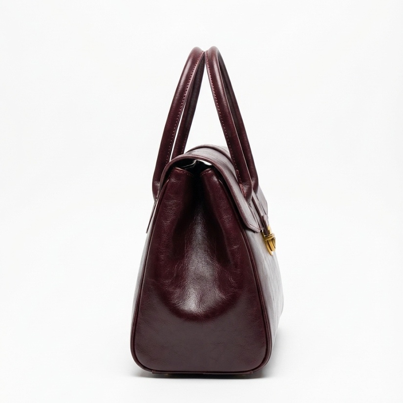 Step out in style with this exquisite cognac satchel, designed to bring a touch of vintage luxury to your daily wardrobe. The bag features a glossy, textured leather finish that catches the light beautifully, enhancing its rich burgundy tones. Its structured silhouette is secured by a distinctive flap closure with a central strap and an elegant antique gold-tone push lock. With sturdy dual top handles, this handbag offers both comfort and durability for all-day wear. The spacious interior is perfect for organizing your essentials, making it an ideal choice for the office, business meetings, or stylish weekend outings.