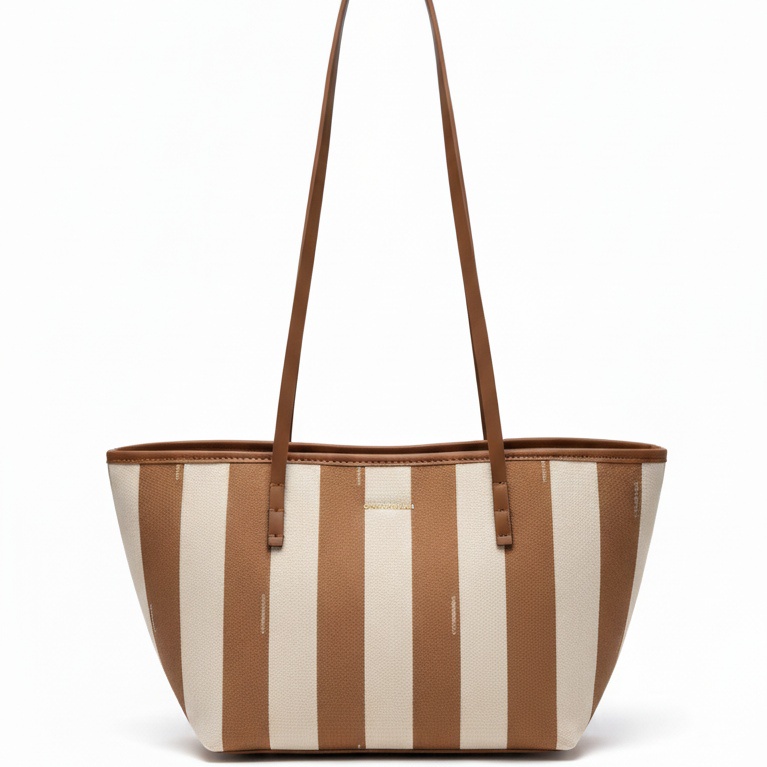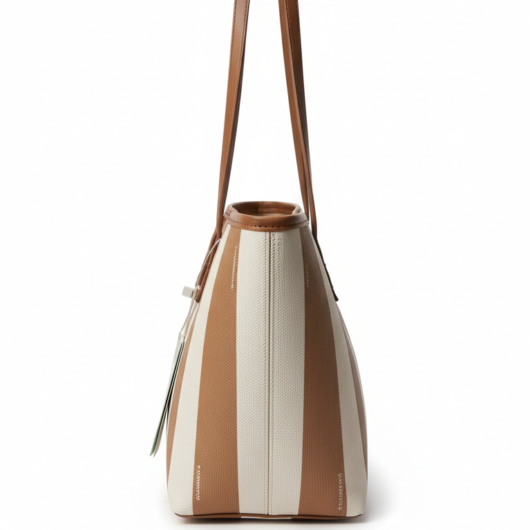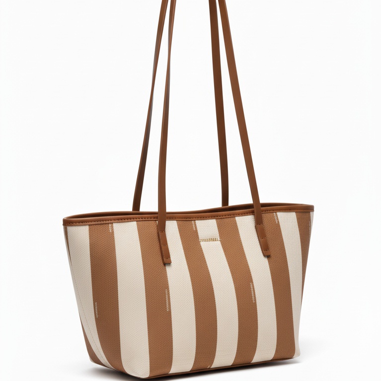 Design: Classic open-top tote shape with a vertical stripe pattern.
