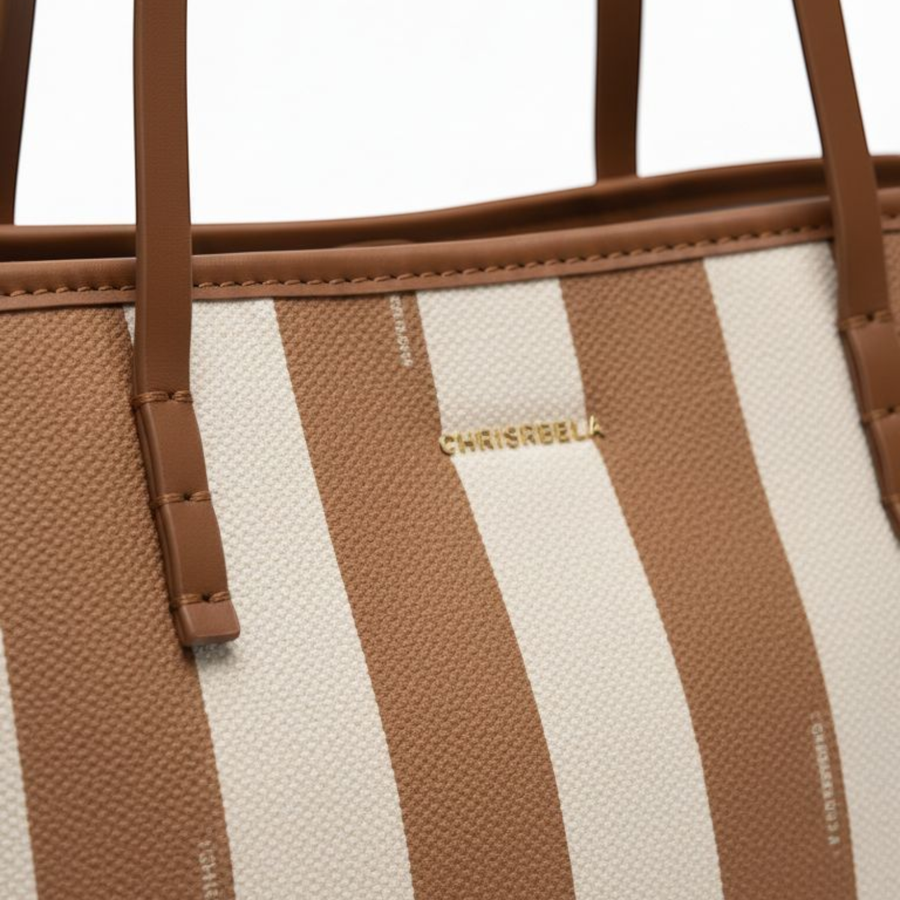 Discover the perfect balance of casual elegance and everyday utility with this exquisite striped tote bag. Crafted from durable high-quality canvas fabric, this bag offers a sturdy texture that is lightweight and stylish. Its classic, spacious silhouette is accentuated by a timeless vertical stripe pattern in tan and cream, adding a chic nautical touch.