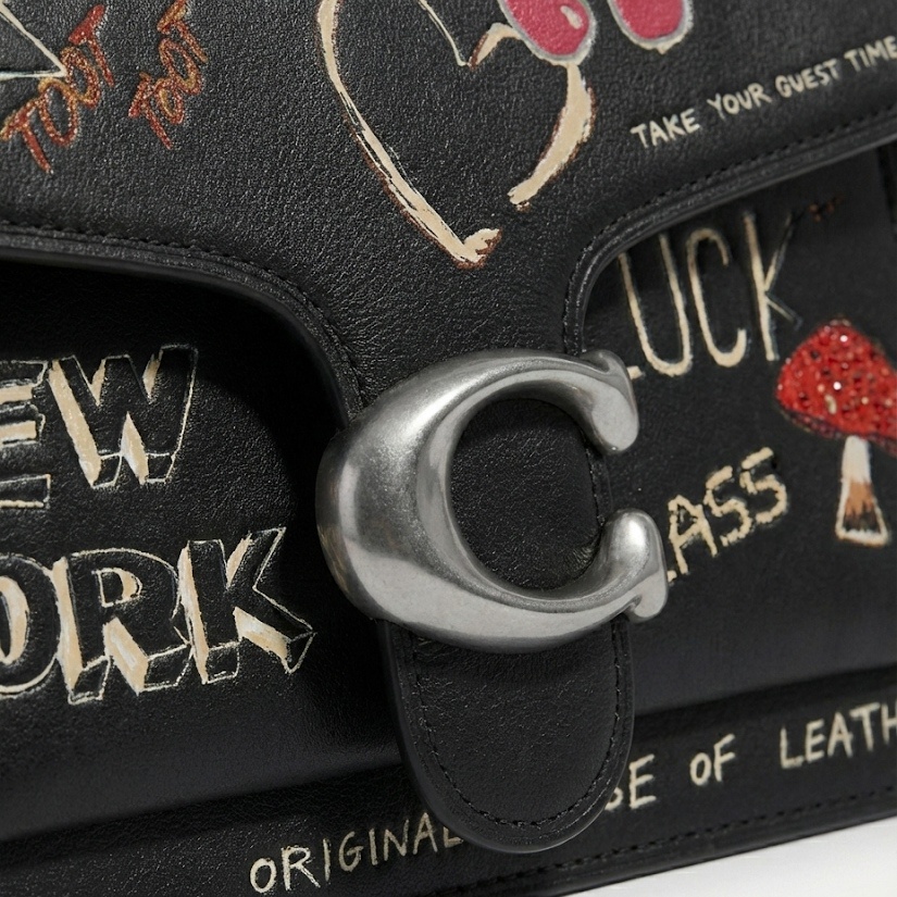 Crafted from refined smooth leather. Adorned with colorful graphic motifs and text details. Antique gold-tone hardware and signature clasp. Detachable and adjustable shoulder strap for versatile wear. Soft fabric lining.