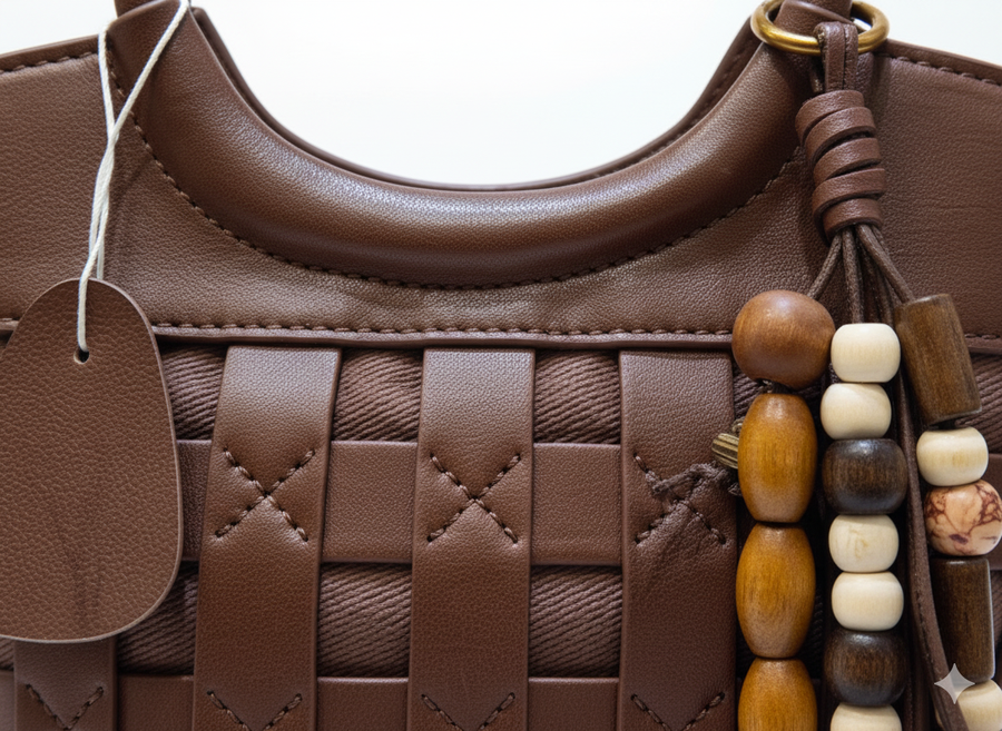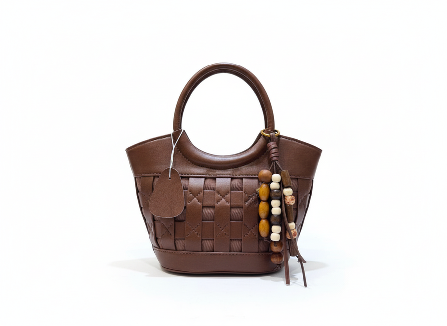 Embrace natural elegance with this beautifully crafted mini-tote. Made from rich, durable brown leather featuring a distinct woven basket-weave texture