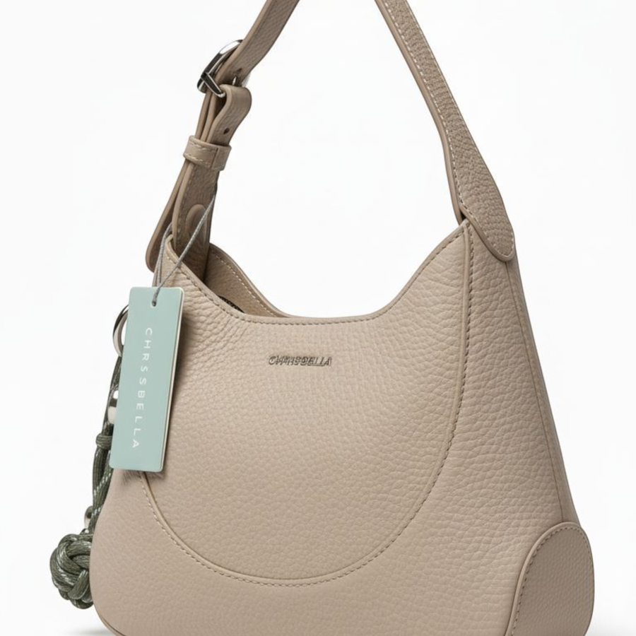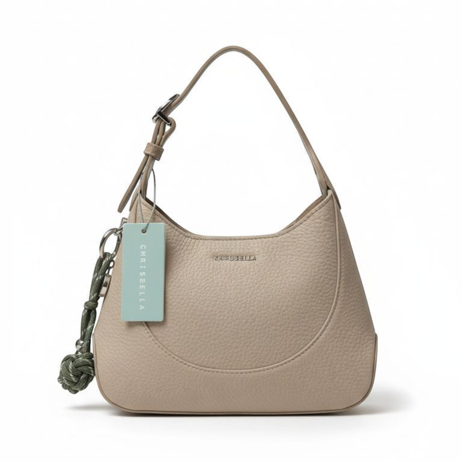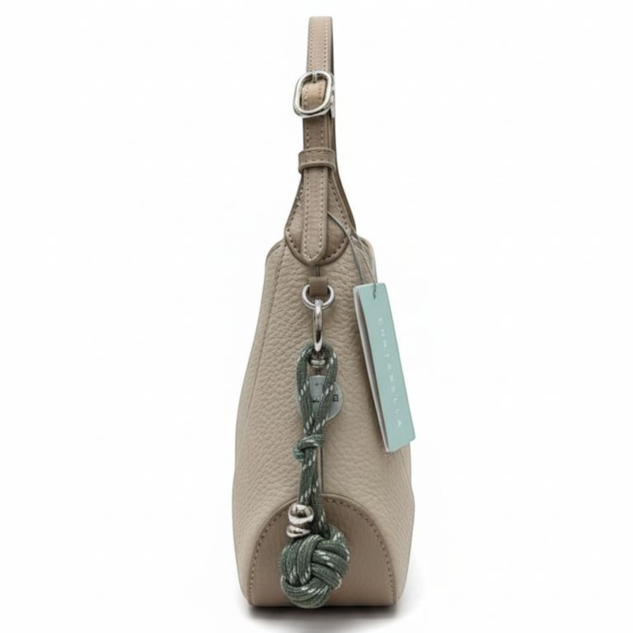 Discover the perfect balance of function and style with this exquisite beige shoulder bag. Crafted from high-quality pebbled leather, this bag offers a rich texture that is durable and soft to the touch. Its clean, crescent silhouette is accentuated by elegant curved stitching and a playful green knotted rope charm, adding a modern trendy touch.