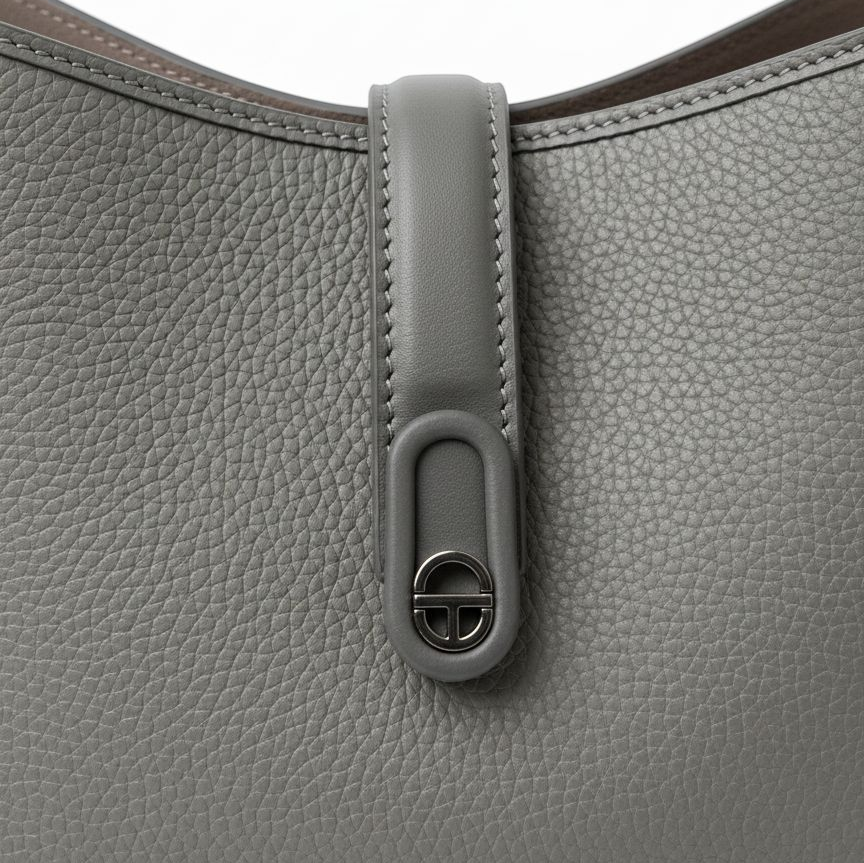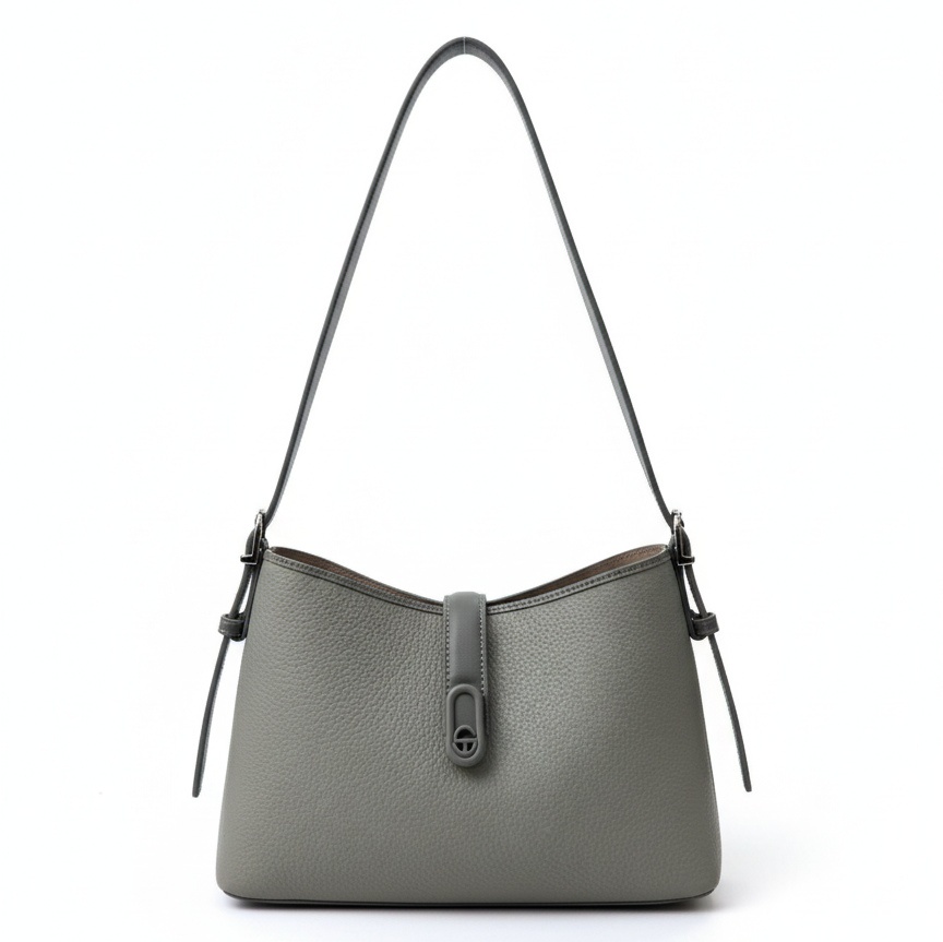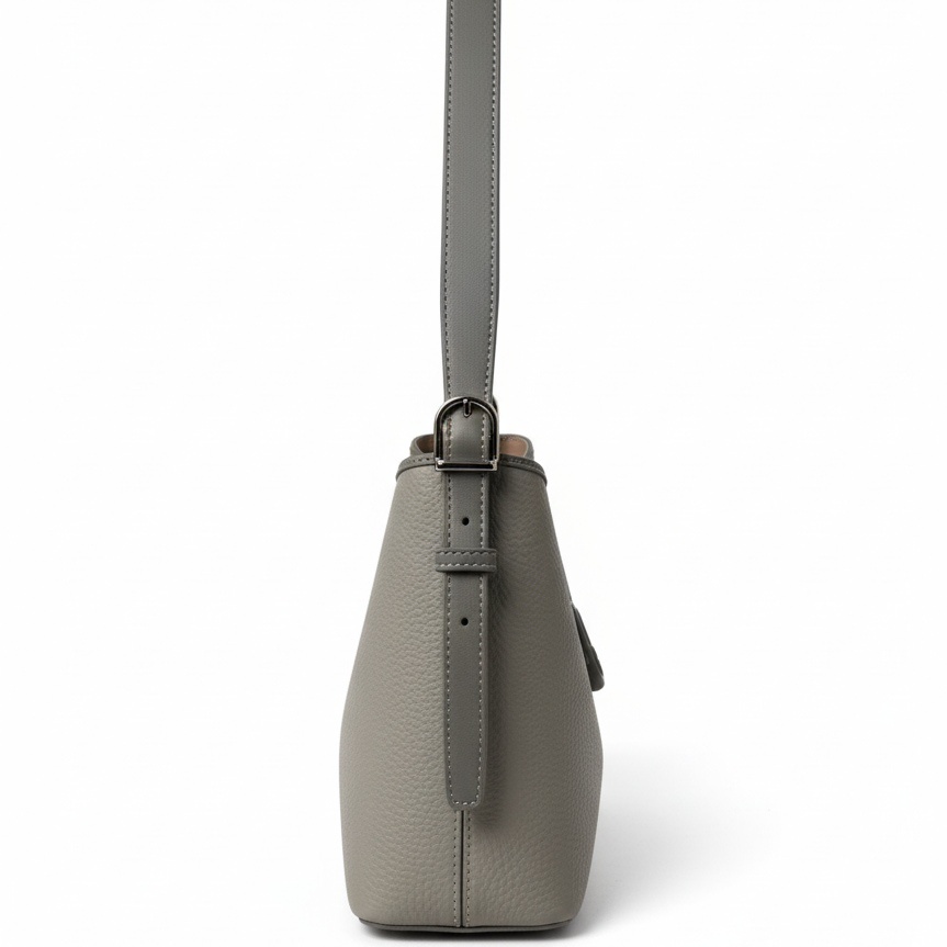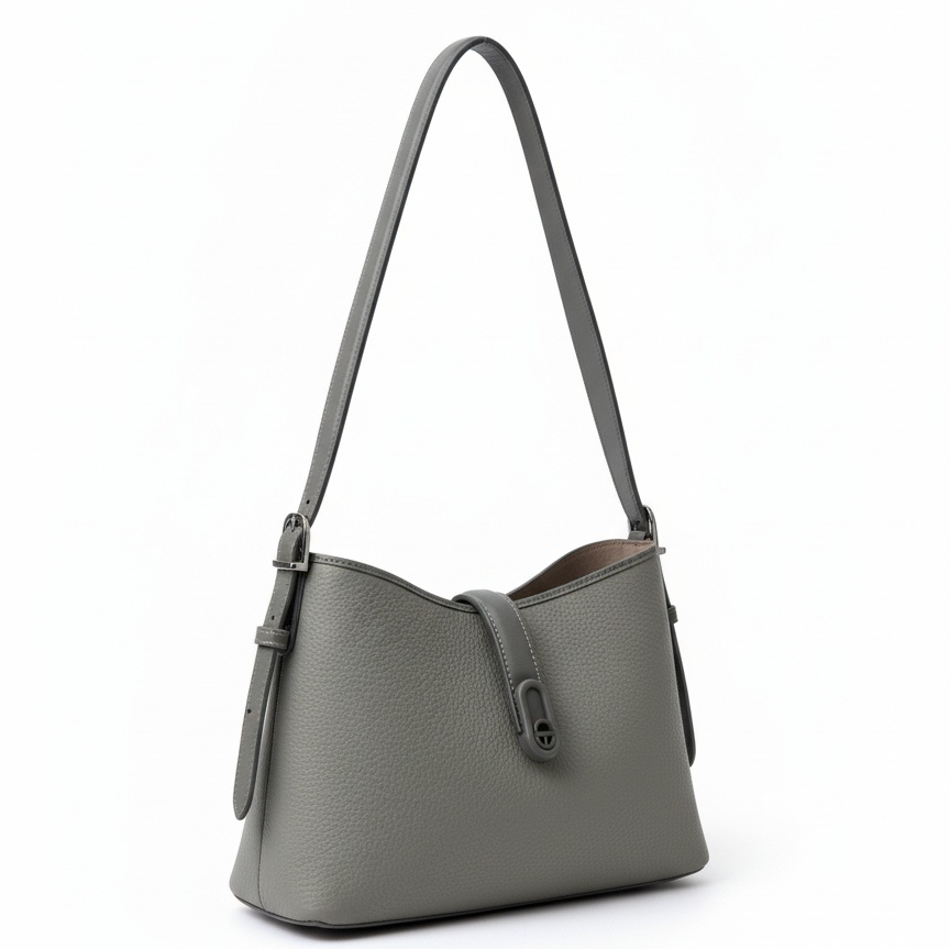 Discover the perfect balance of function and style with this exquisite grey shoulder bag. Crafted from high-quality pebbled leather, this bag offers a rich texture that is durable and soft to the touch. Its clean, minimalist silhouette is accentuated by a unique central tab closure with a sleek loop lock, adding a modern architectural touch.