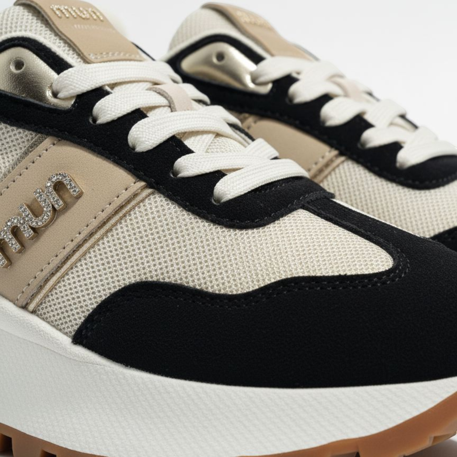 Step into comfort and style with these statement platform trainers. Featuring a versatile mix of beige, black, and tan, these sneakers are the ultimate addition to your wardrobe. The breathable mesh construction keeps your feet cool, while the chunky sole provides excellent support and a boost of height. Finished with elegant rhinestone details, they are perfect for pairing with jeans, leggings, or joggers.