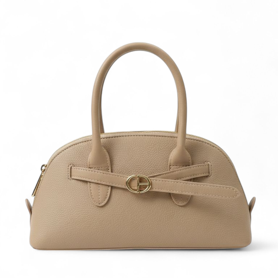 Discover the perfect balance of timeless charm and modern elegance with this exquisite beige top-handle bag. Crafted from high-quality pebbled leather, this bag offers a rich texture that is durable and soft to the touch. Its graceful, dome-shaped silhouette is accentuated by a chic front belt detail with a gold-tone interlocking buckle, adding a sophisticated decorative touch.