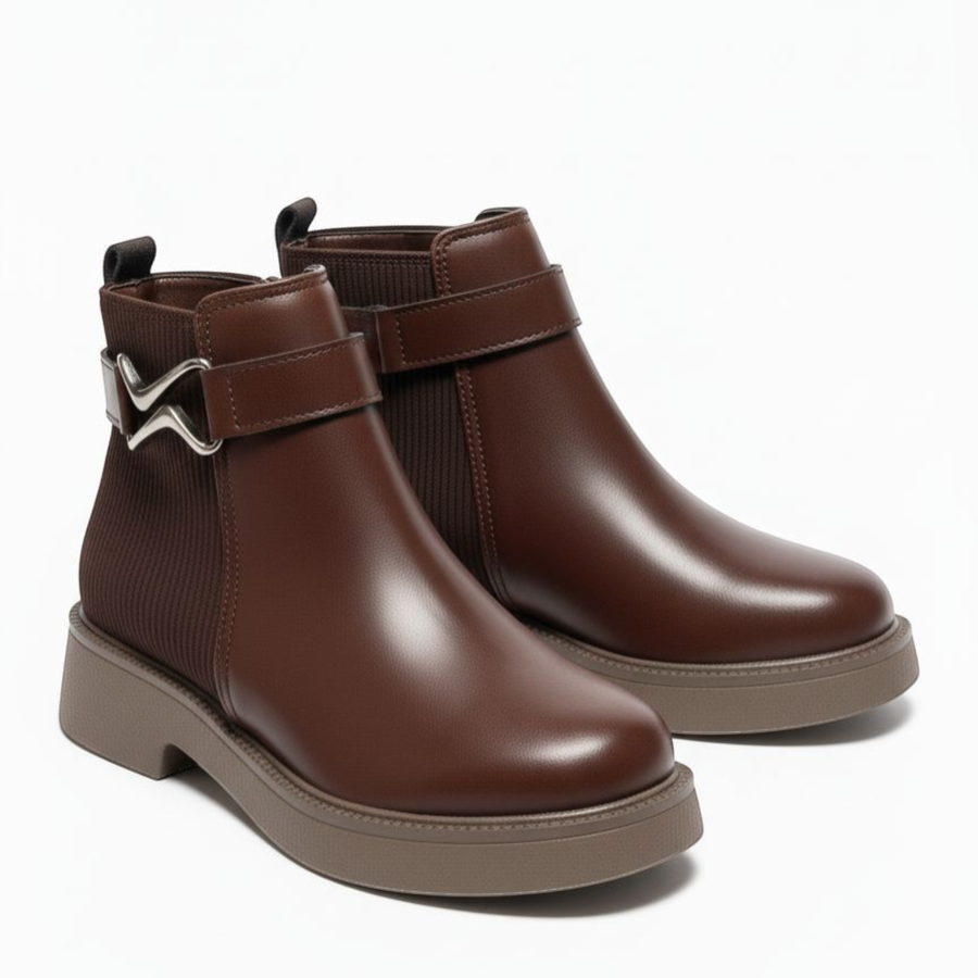 Step into a blend of modern edge and timeless comfort with these striking Brown ankle boots. Expertly crafted from smooth, high-quality leather paired with a ribbed knit back panel, this design offers a sophisticated mix of textures that contours perfectly to your ankle. The sleek silhouette is highlighted by a distinctive silver-tone metal buckle on the side, adding a refined architectural accent.