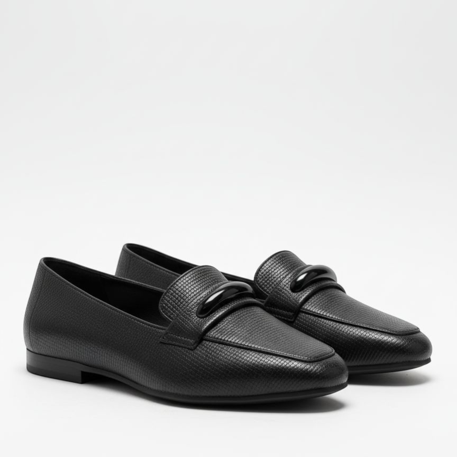 Step into contemporary elegance with these black textured loafers. Defined by a chic interlocking buckle and a sophisticated snake-effect finish, this pair offers a refined silhouette that instantly elevates your workwear or weekend ensembles.