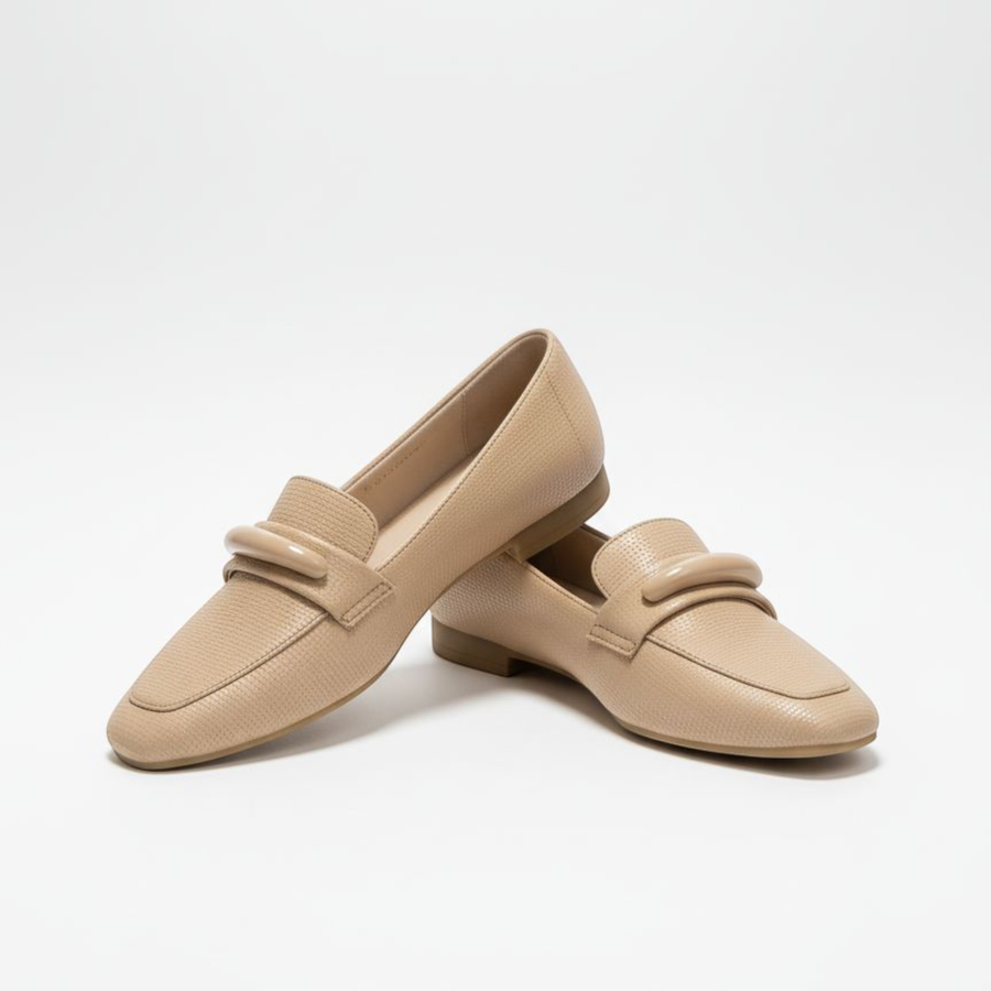 Step into contemporary elegance with these beige textured loafers. Defined by a chic interlocking buckle and a sophisticated snake-effect finish, this pair offers a refined silhouette that instantly elevates your workwear or weekend ensembles.