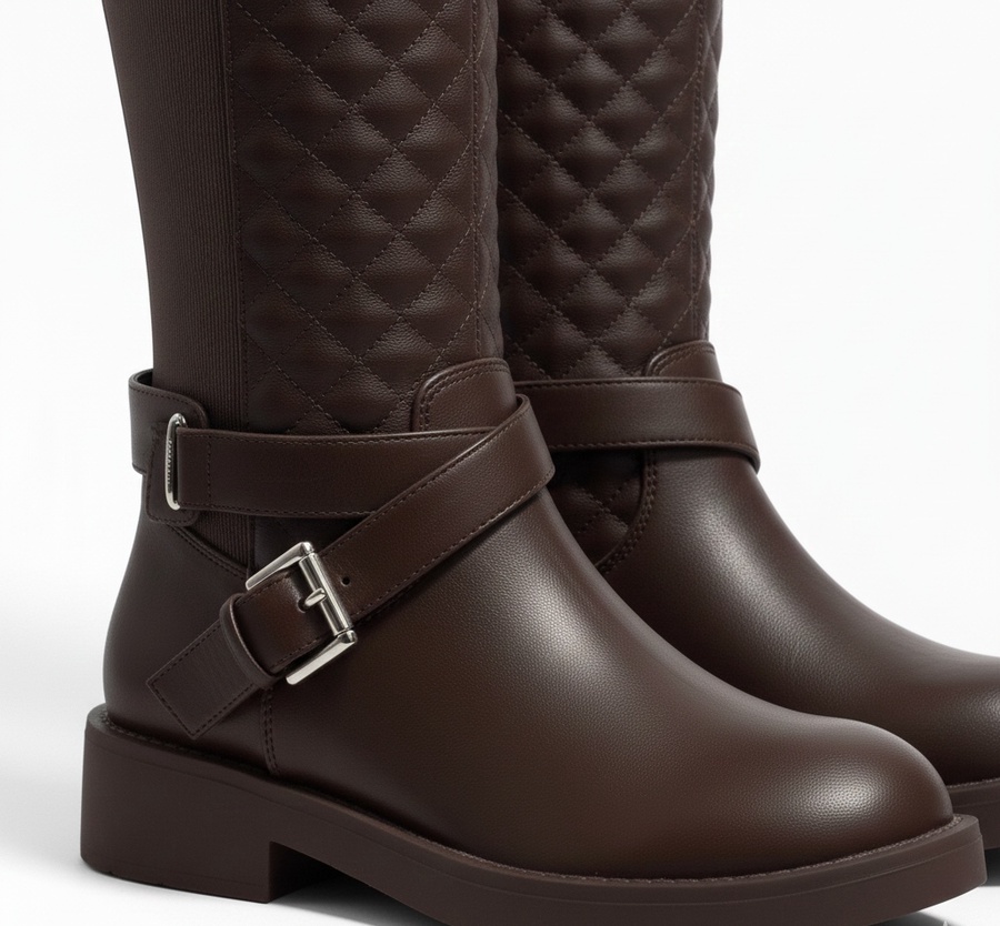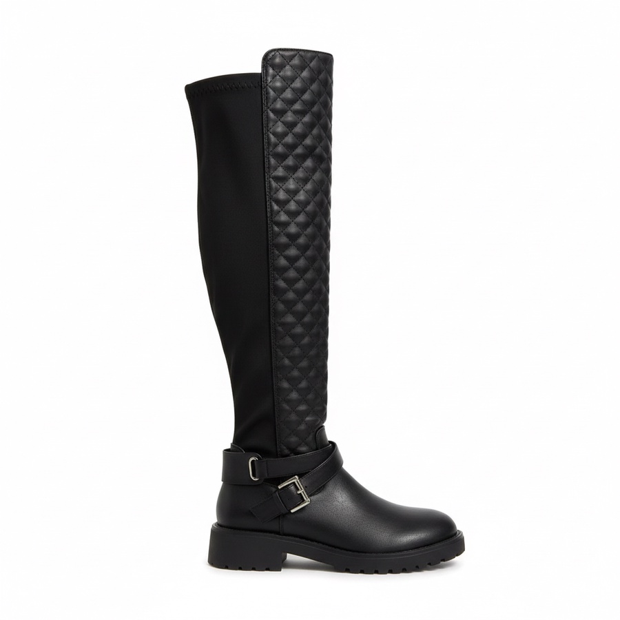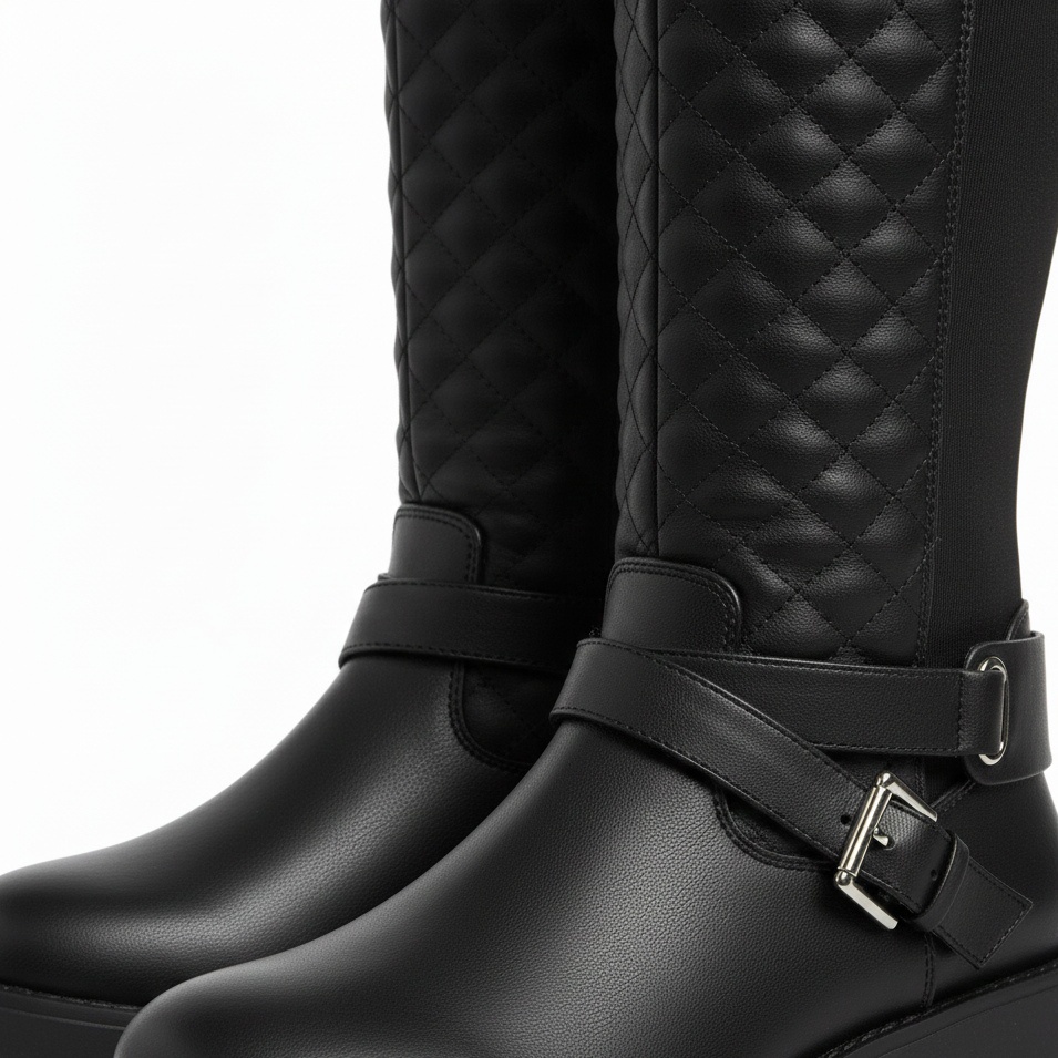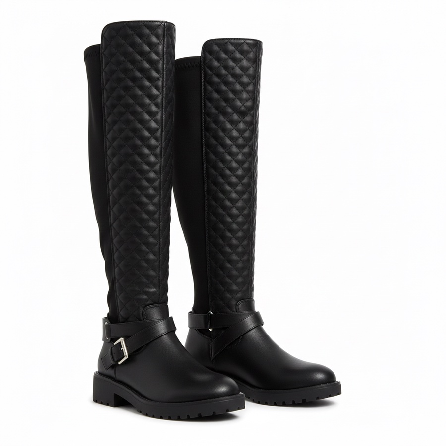 Elevate your winter wardrobe with this luxurious over-the-knee boot that perfectly blends warmth and high fashion. The design features a compelling contrast between the soft, diamond-patterned quilted front panel and the high-quality stretch textile back panel, ensuring a sleek, tight fit along the leg and preventing any sagging. The look is completed with an elegant smooth leatherette strap and a polished metallic buckle for a contemporary touch.