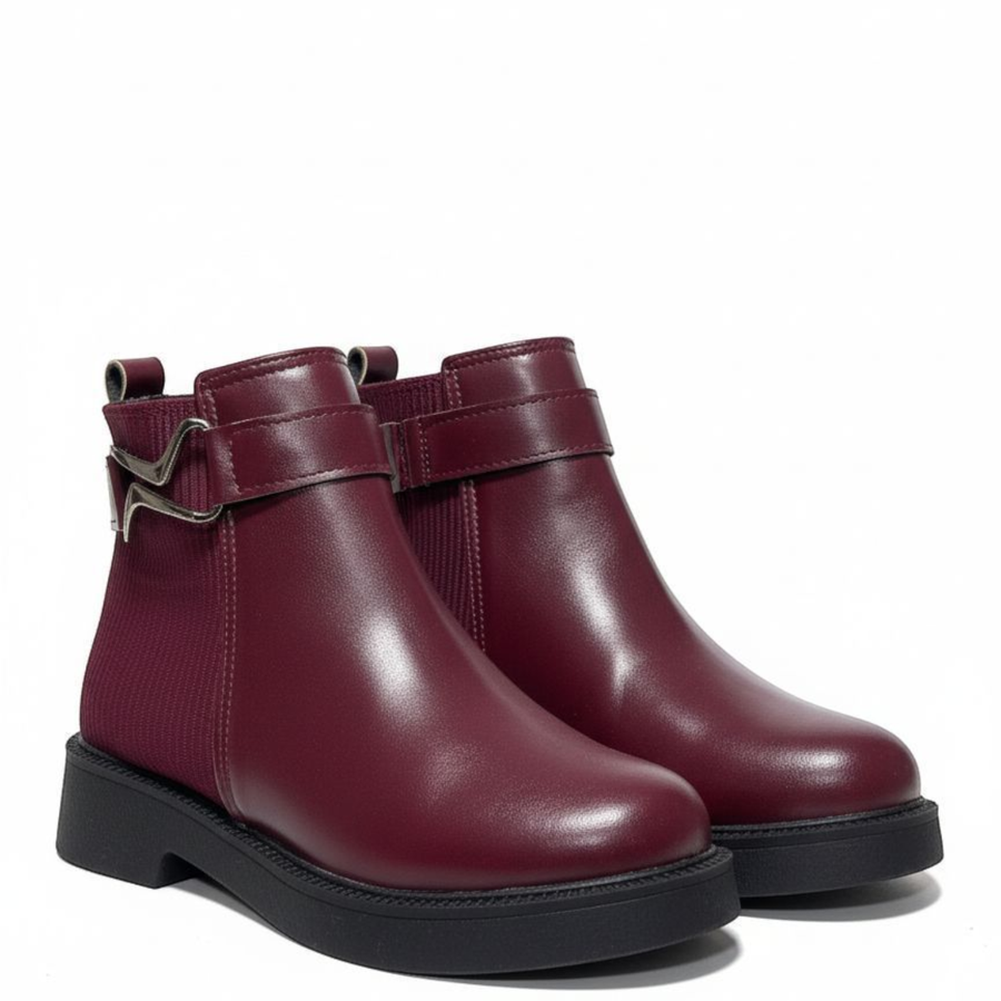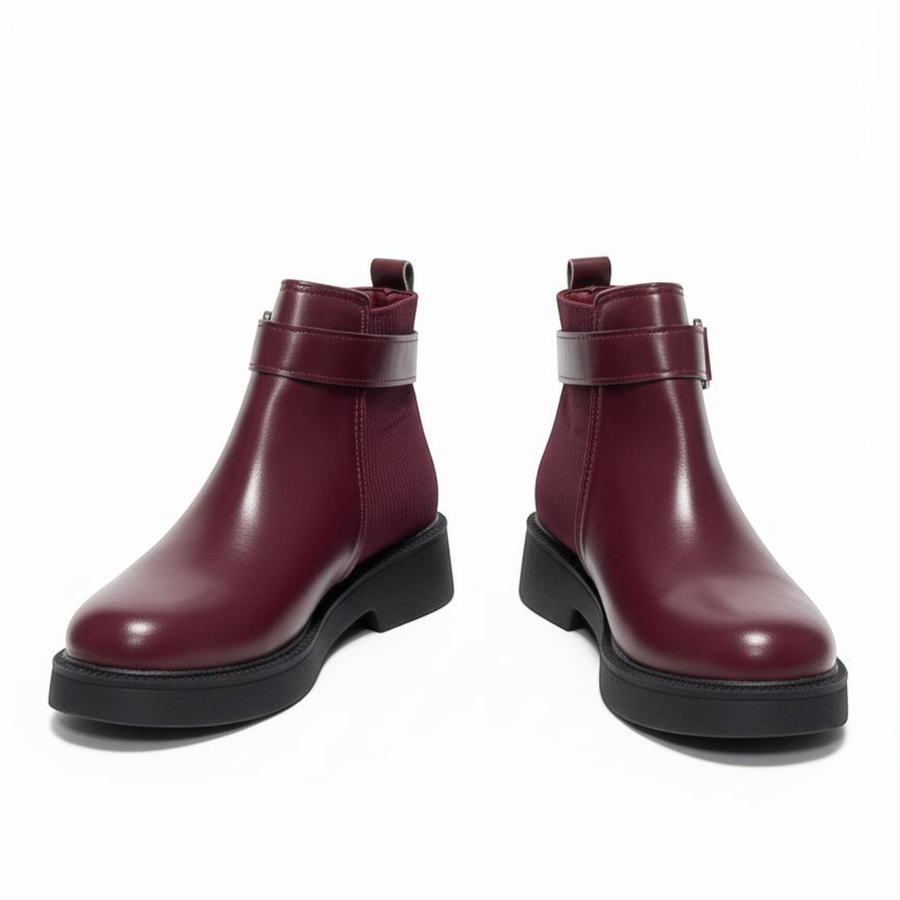 Step into a blend of modern edge and timeless comfort with these striking Burgundy ankle boots. Expertly crafted from smooth, high-quality leather paired with a ribbed knit back panel, this design offers a sophisticated mix of textures that contours perfectly to your ankle. The sleek silhouette is highlighted by a distinctive silver-tone metal buckle on the side, adding a refined architectural accent.