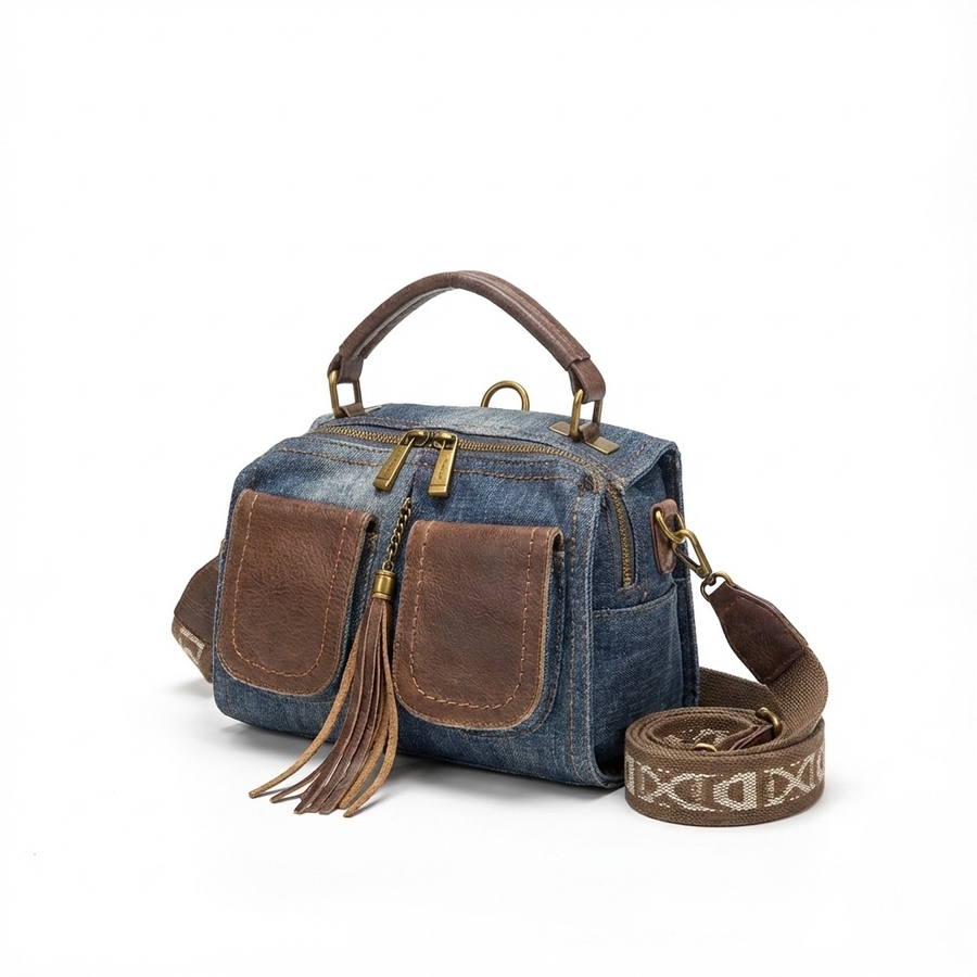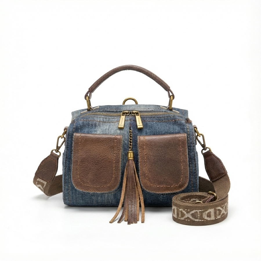 A versatile everyday bag designed for functionality and style. Crafted from durable blue denim, this boxy messenger bag features two convenient front pockets with leather flaps, perfect for keeping your phone or keys within reach. It comes with a sturdy top handle and a wide, adjustable webbed shoulder strap for all-day comfort. The spacious interior and secure zipper closure make it an ideal companion for work, university, or travel.