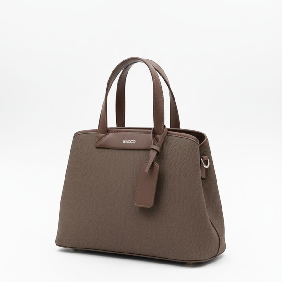 Discover the perfect balance of understated luxury and everyday practicality with this exquisite mocha brown handbag. Crafted from high-quality textured material with smooth leather trim, this bag offers a sophisticated finish that is durable and refined. Its clean, trapezoidal silhouette is accentuated by a sleek top panel featuring the minimal logo and a matching hanging tag, adding a professional, branded touch.