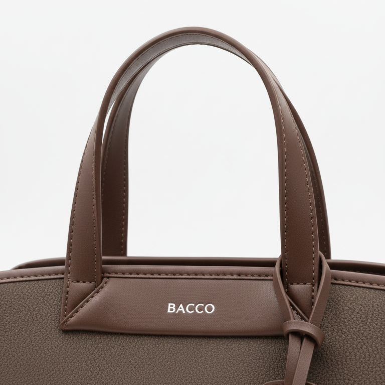 Accents: Central "BACCO" logo print and a decorative hanging leather tag.