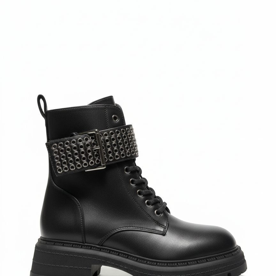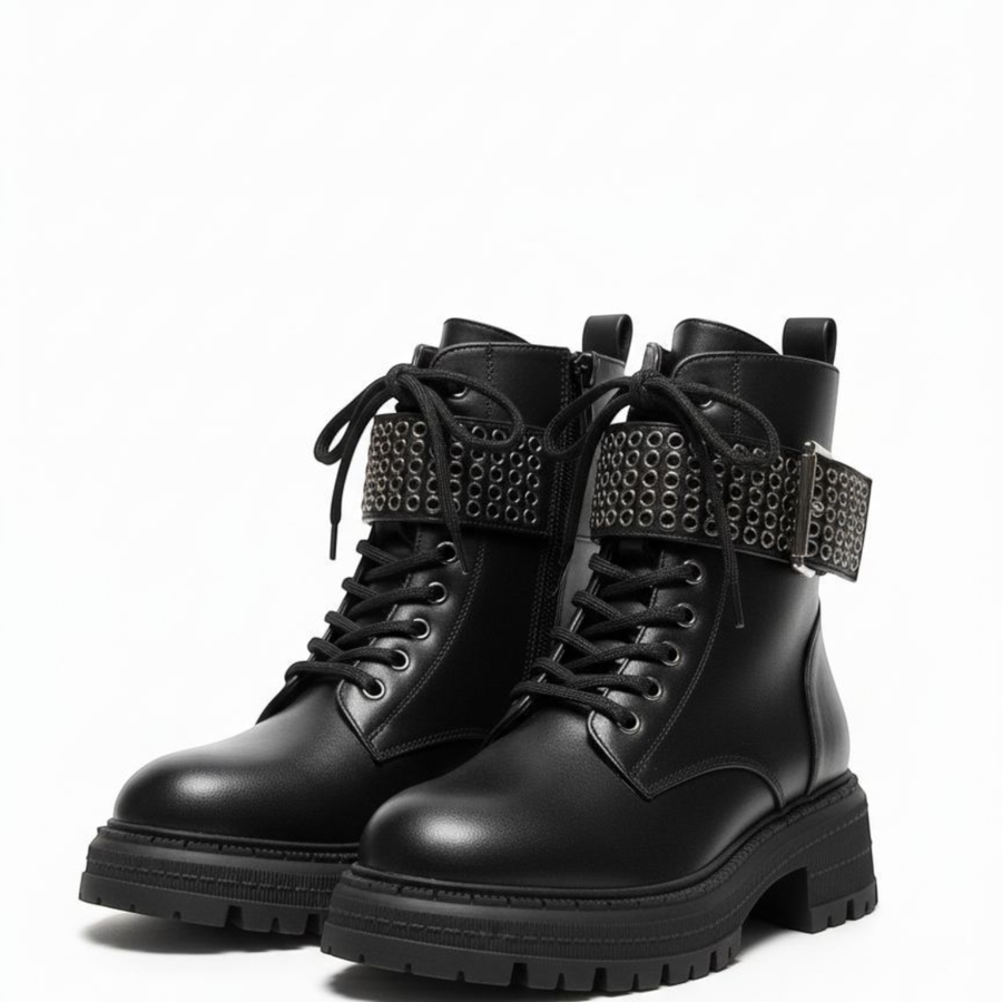 Discover the perfect blend of edgy style and everyday function with these statement black combat boots. Crafted from high-quality smooth leather, this pair offers a sleek finish that is durable and polished. The bold silhouette is accentuated by a wide ankle strap embellished with rows of metallic grommets, adding a unique, rock-chic aesthetic.