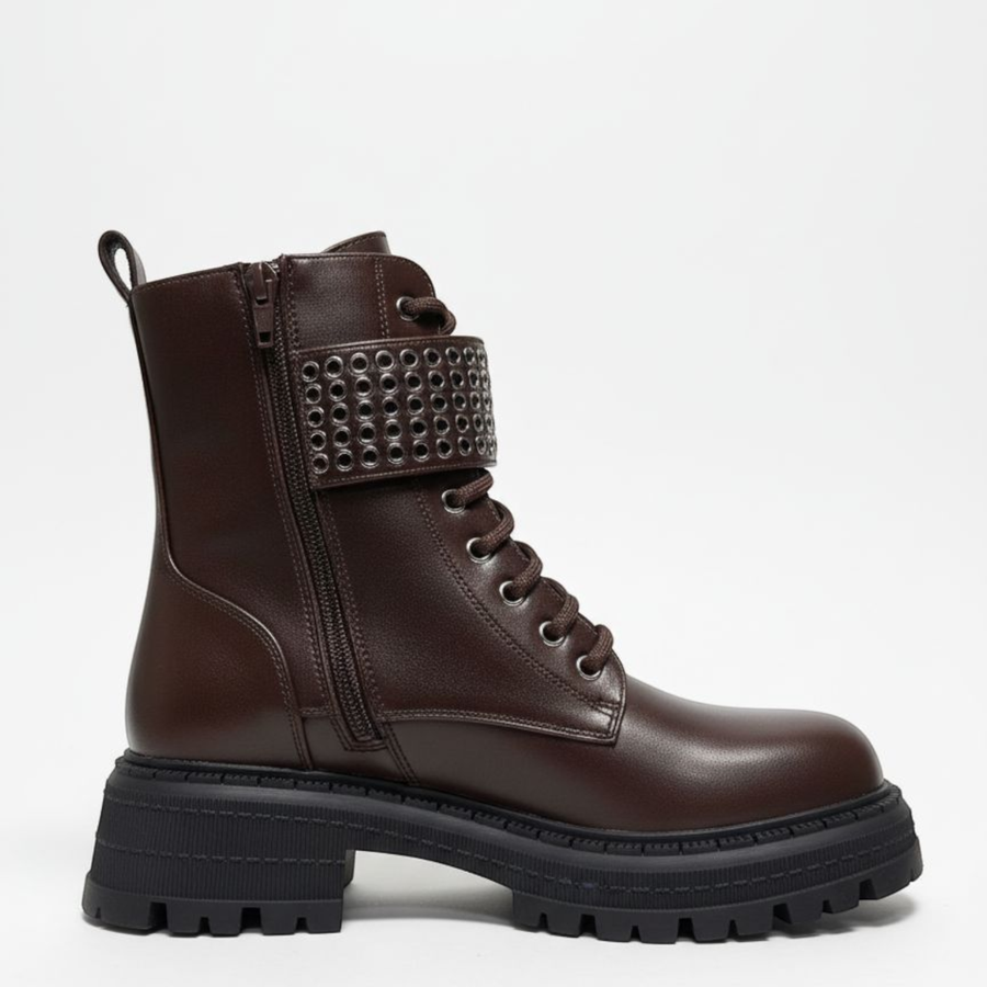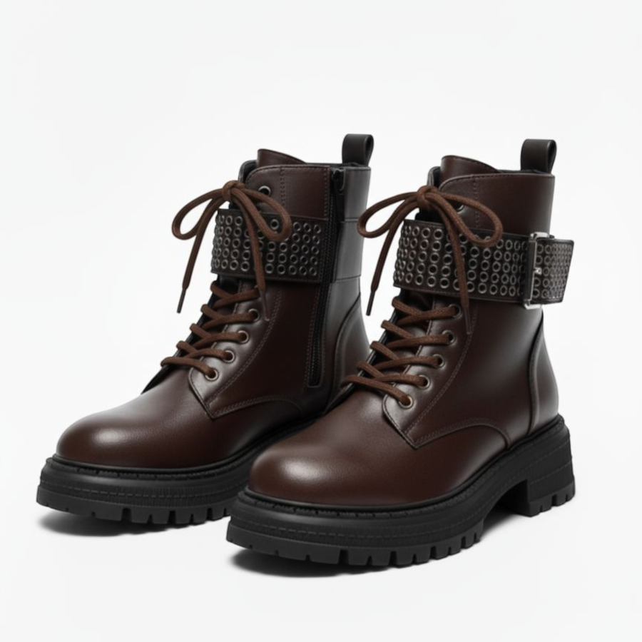 Discover the perfect blend of edgy style and everyday function with these statement brown combat boots. Crafted from high-quality smooth leather, this pair offers a sleek finish that is durable and polished. The bold silhouette is accentuated by a wide ankle strap embellished with rows of metallic grommets, adding a unique, rock-chic aesthetic.